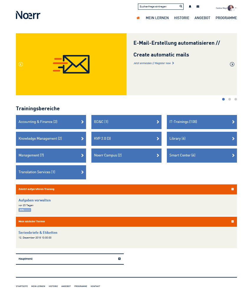 The prior LMS was no longer able to support the additional requirements that arose from the departments of Knowledge Management and Human Resources. Up to that point, online training was managed with an open-source software without any learning plans, and HR software interface. Face-to-face training was managed in different formats, such as Excel files and with Persis (Noerr’s HR software). Noerr was looking for a platform where its employees could find everything regarding additional instruction from E-Learning to face-to-face training, all in one place.