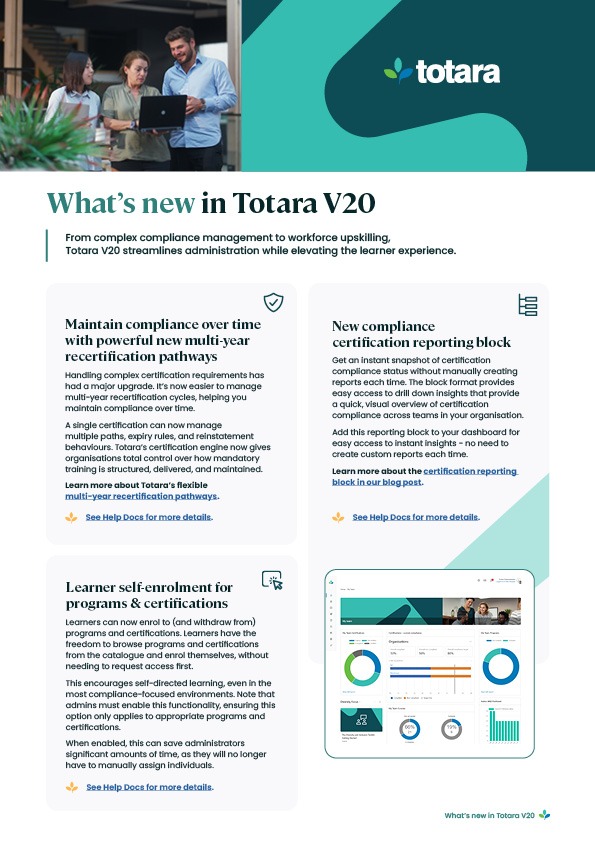 This PDF provides an overview of what’s new in Totara V20. You may wish to check out our ‘What’s new in Totara V20’ summary blog post, which contains a few more handy links to further resources and includes a feature summary video.